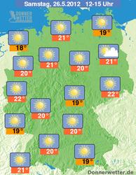 Am Sonntag ziehen dann wahrscheinlich Wolken auf, die aber nach dem jetzigen Stand nur im Südosten und an der Nordsee vereinzelte Schauer bringen. Die Temperaturen steigen am Sonntag auf Werte zwischen 18 Grad an der Ostsee und 24 Grad im Westen. Im Süden und Osten wird es sonnig bei wechselnder Bewölkung und Temperaturen um 21 °C.