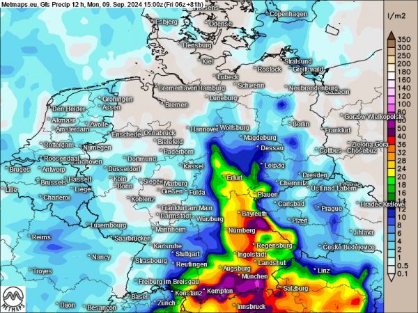 12-Stunden-Niederschlagsmengen bis Montag (15:00 Uhr)