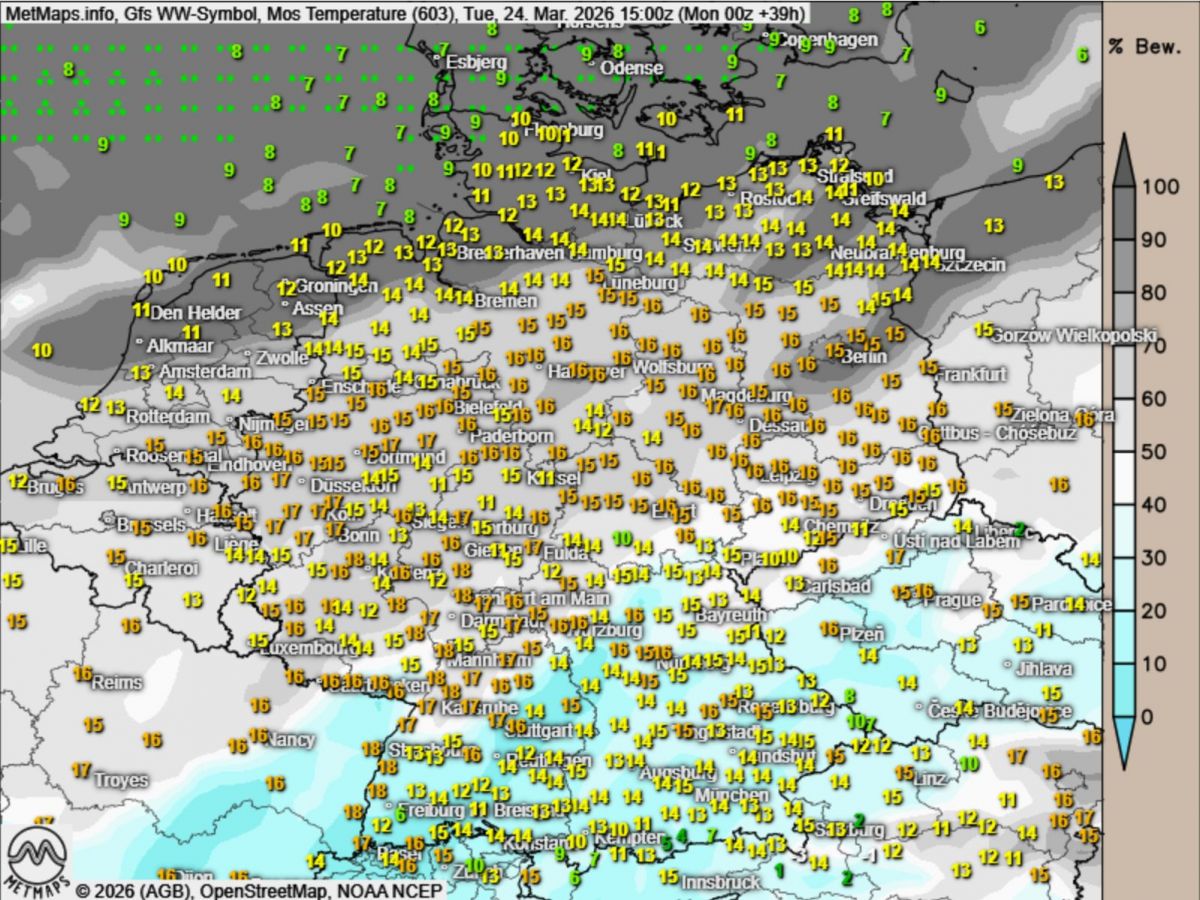 Bis zum Mittwoch etabliert sich die kühlere Luftmasse landesweit. Die Temperaturen gehen spürbar zurück, das Wetter zeigt sich deutlich wechselhafter mit dichteren Wolkenfeldern und einzelnen Schauern.