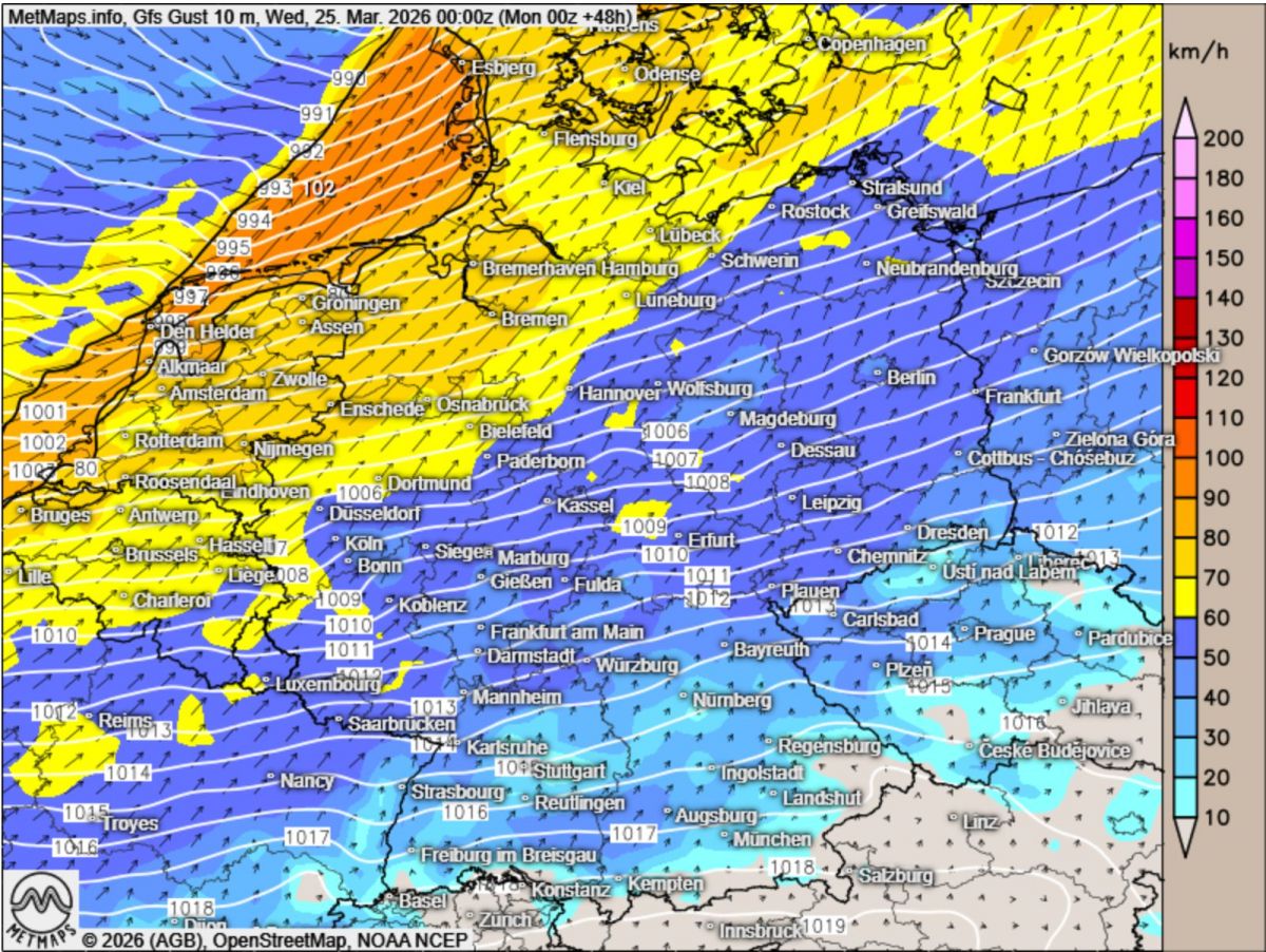Mit der heranströmenden polaren Meeresluft setzt ein markanter Wetterwechsel ein. Zunächst erfasst ein kräftiges Windfeld den Norden und die Mitte Deutschlands. Besonders im Bereich der Nordsee sind stürmische Böen zu erwarten, die sich im Verlauf der Nacht weiter landeinwärts ausbreiten können.