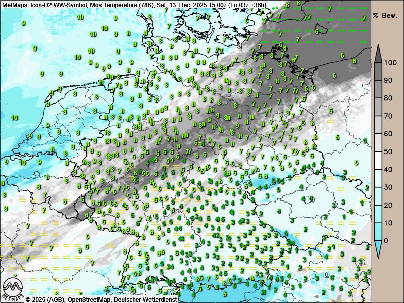 Nachts ist weiterhin an den Alpen und im Erzgebirge mit Nebel und Bodenfrost zu rechnen, sonst bleibt es meist zu mild für Frosttemperaturen.