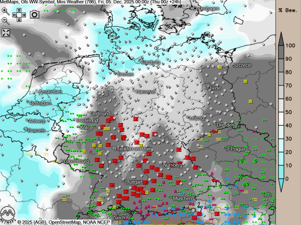 Am besten wird der Blick in den Himmel und auf den "Julmond" in der kommenden Nacht in den nördlichen und westlichen Landesteilen gelingen - die Wetter- und Bewölkungskarte für Freitag (00:00 Uhr) nach GFS: