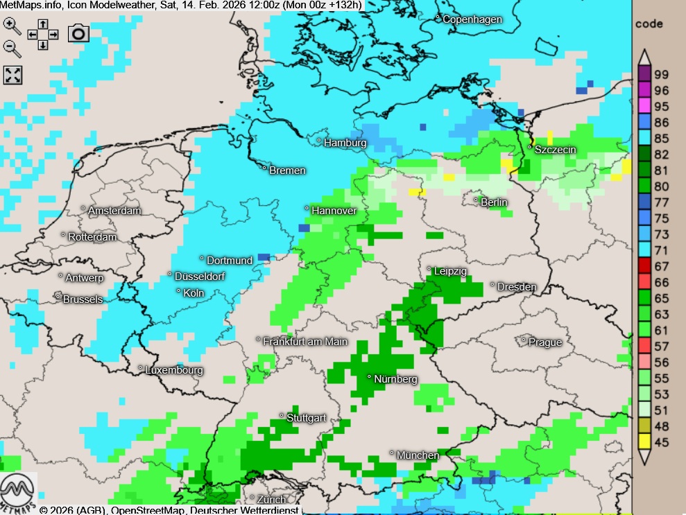 Wetterkarte14.02.2026, 12:00 Uhr (Regen grün, Schnee blau)