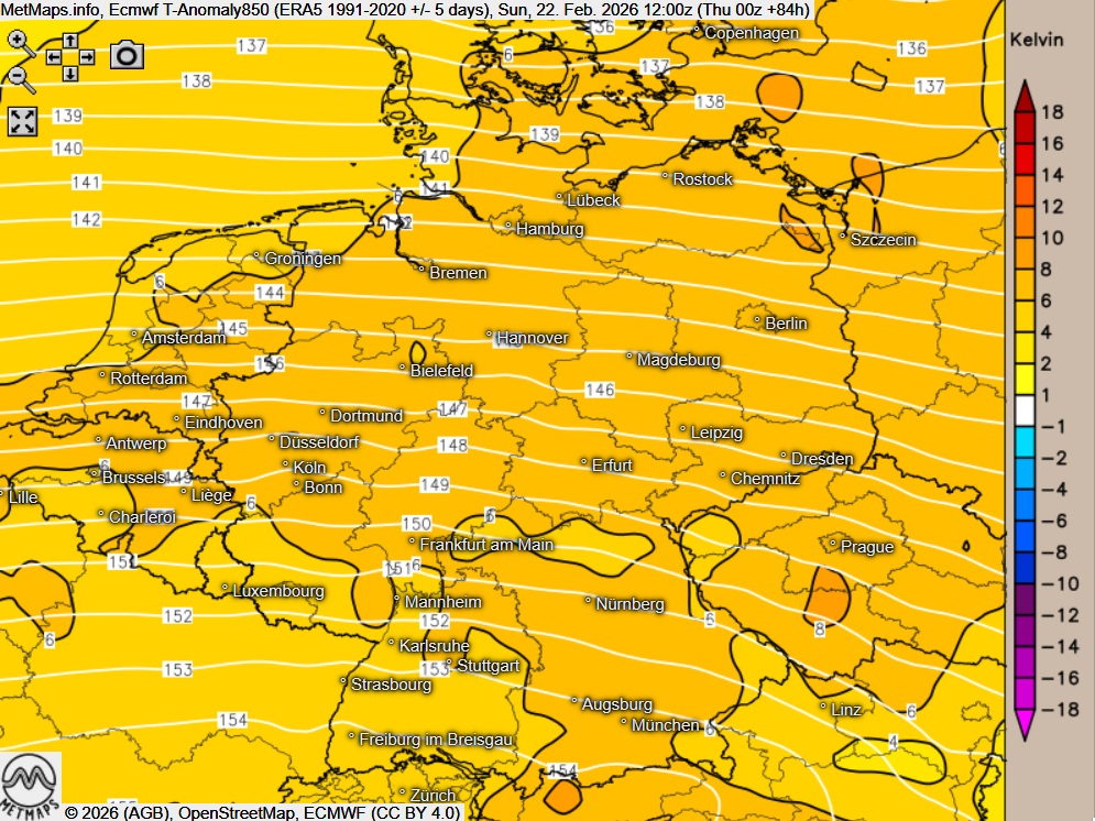 Temperaturabweichung Sonntagmittag: Überall zu mild - ein seltenes Bild in den letzten Wochen.
