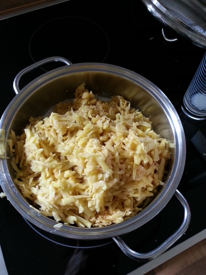 Die geschälten Kartoffeln auf einem Reibeisen reiben und in einem Tuch so lange auspressen, bis sie ganz trocken sind.